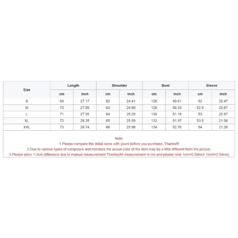 Taille : M Longueur : 70 cm (27,56 pouces) Épaules : 63 cm (24,80 pouces) Poitrine : 128 cm (50,39 pouces) Manches : 52,5 cm (20,67 pouces)